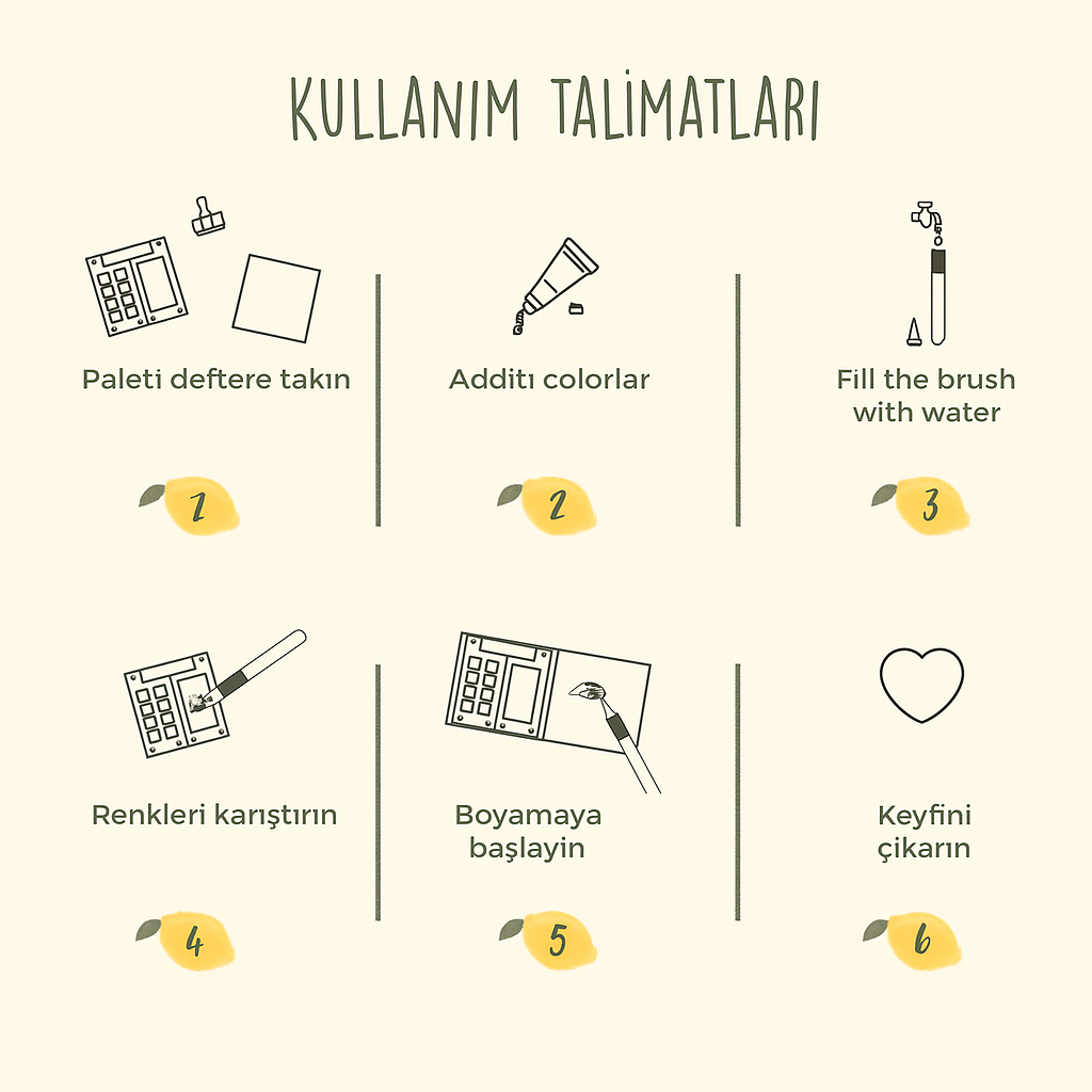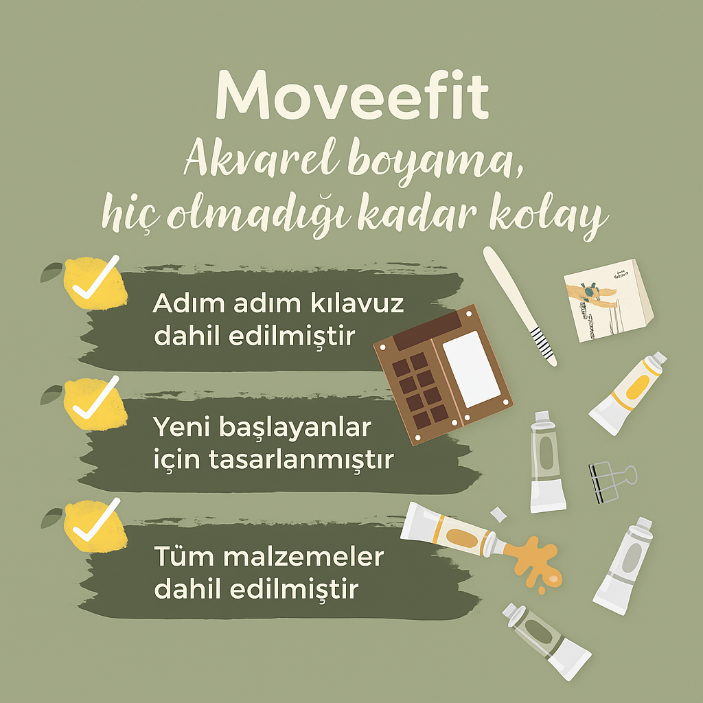 Palet, su bazlı boyalar, fırçalar, boyama kâğıtları ve rehber kartlar dahil! Yani ihtiyacınız olan her şey tek kutuda.